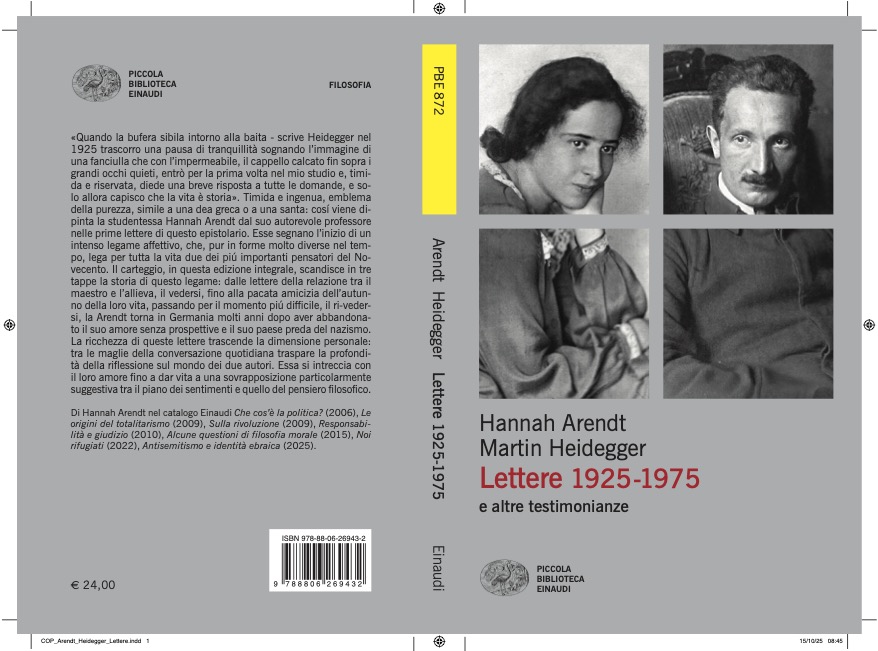 La ricchezza di queste lettere trascende la dimensione personale: tra le maglie della conversazione quotidiana traspare la profondità della riflessione sul mondo dei due autori. Essa si intreccia con il loro amore fino a dar vita a una sovrapposizione particolarmente suggestiva tra il piano dei sentimenti e quello del pensiero filosofico. Ci riferiamo al libro di Hannah Arendt e Martin Heidegger, "Lettere 1925-1975 e altre testimonianze" (Einaudi, 336 pagine, 24 Euro). «Quando la bufera sibila intorno alla baita – scrive Heidegger nel 1925 - trascorro una pausa di tranquillità sognando l'immagine di una fanciulla che con l'impermeabile, il cappello calcato fin sopra i grandi occhi quieti, entrò per la prima volta nel mio studio e, timida e riservata, diede una breve risposta a tutte le domande, e solo allora capisco che la vita è storia». Timida e ingenua, emblema della purezza, simile a una dea greca o a una santa: così viene dipinta la studentessa Hannah Arendt dal suo autorevole professore nelle prime lettere di questo epistolario. Esse segnano l'inizio di un intenso legame affettivo, che, pur in forme molto diverse nel tempo, lega per tutta la vita due dei più importanti pensatori del Novecento. Il carteggio, in questa edizione integrale, scandisce in tre tappe la storia di questo legame: dalle lettere della relazione tra il maestro e l'allieva, il vedersi, fino alla pacata amicizia dell'autunno della loro vita, passando per il momento più difficile, il ri-vedersi, la Arendt torna in Germania molti anni dopo aver abbandonato il suo amore senza prospettive e il suo paese preda del nazismo.